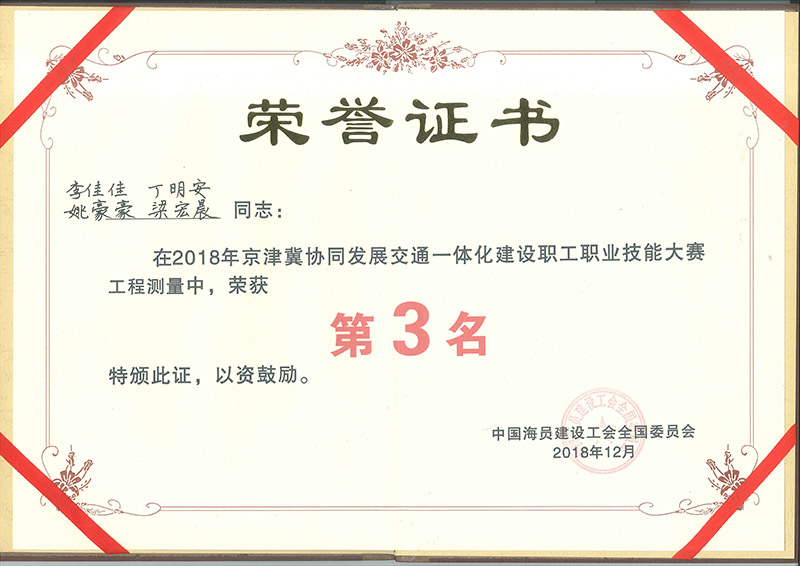 12月7日,2018年度京津冀協(xié)同發(fā)展交通一體化建設(shè)勞動(dòng)和技能競(jìng)賽在北京舉辦,公司員工李佳佳、丁明安、姚豪豪和梁宏晨四名員工組成的代表隊(duì)代表天津市賽區(qū)參賽,并在比賽中斬獲測(cè)量組團(tuán)體第三名的好成績(jī)。
