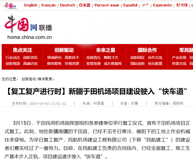 4月3日,中國網(wǎng)·中國通《復(fù)工復(fù)產(chǎn)進(jìn)行時》欄目,以“新疆于田機(jī)場項目建設(shè)駛?cè)搿燔嚨馈睘轭},對公司第九總經(jīng)理部承建的新疆于田民用機(jī)場工程場道及附屬設(shè)施工程三標(biāo)段復(fù)工復(fù)產(chǎn)情況進(jìn)行了專題報道。