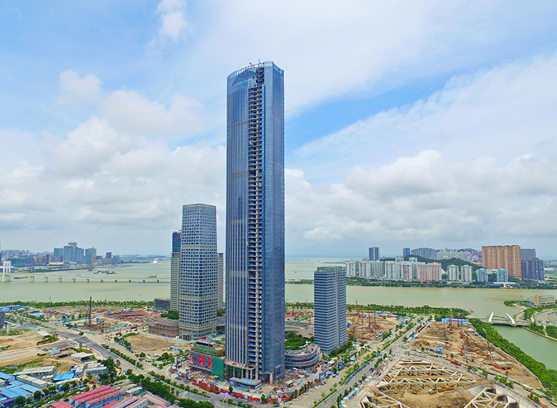 此次獲獎(jiǎng)的中交匯通橫琴廣場項(xiàng)目3號(hào)主塔樓建筑高度為309.4米,結(jié)構(gòu)形式為鋼管混凝土框架+鋼筋砼核心筒+伸臂桁架結(jié)構(gòu)體系,其中外框由12根鋼管混凝土柱作為豎向支撐構(gòu)件;核心筒地下-4至8層、20至22層、41至43層為鋼板剪力墻結(jié)構(gòu);21層、42層為伸臂桁架抗側(cè)力體系,整體鋼構(gòu)重量約3萬噸,其中單體最重鋼構(gòu)構(gòu)件重量為49.8噸。