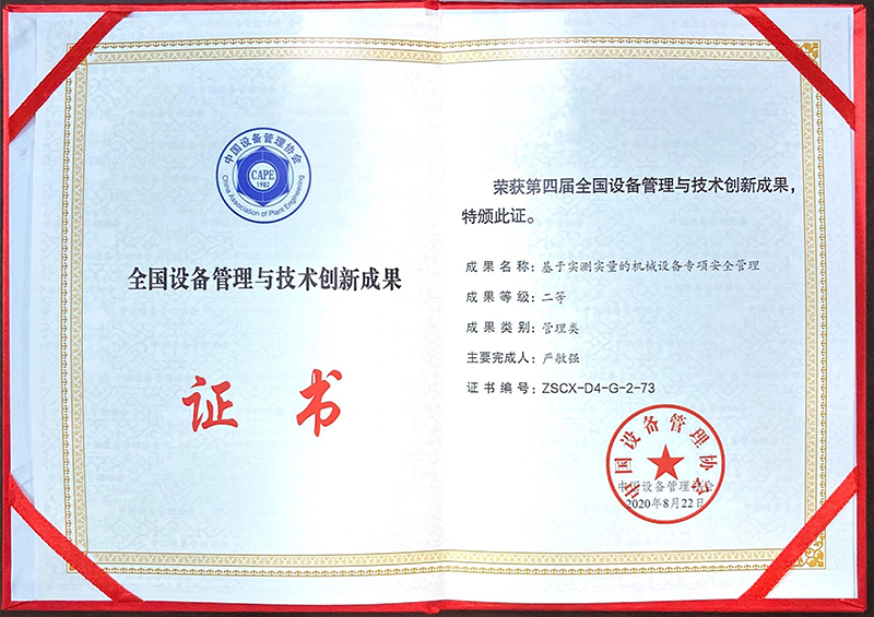 8月22日至23日,由國家發(fā)展和改革委員會、工業(yè)和信息化部指導,中國設備管理協(xié)會、浙江省江山市人民政府主辦的第四屆全國設備管理與技術(shù)創(chuàng)新成果交流大會在浙江省江山市隆重召開。公司申報的“基于實測實量的機械設備專項安全管理”成果,榮獲第四屆全國設備管理與技術(shù)創(chuàng)新成果管理類二等獎。