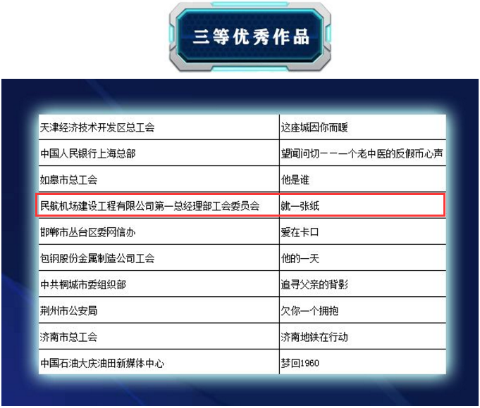 10月28日,從全國總工會官微獲悉,全國工會網(wǎng)絡(luò)正能量微視頻征集活動評選結(jié)果揭曉,公司第一總經(jīng)理部攝制的微視頻《就一張紙》從1600余部作品中脫穎而出,喜獲“三等優(yōu)秀作品”獎。
