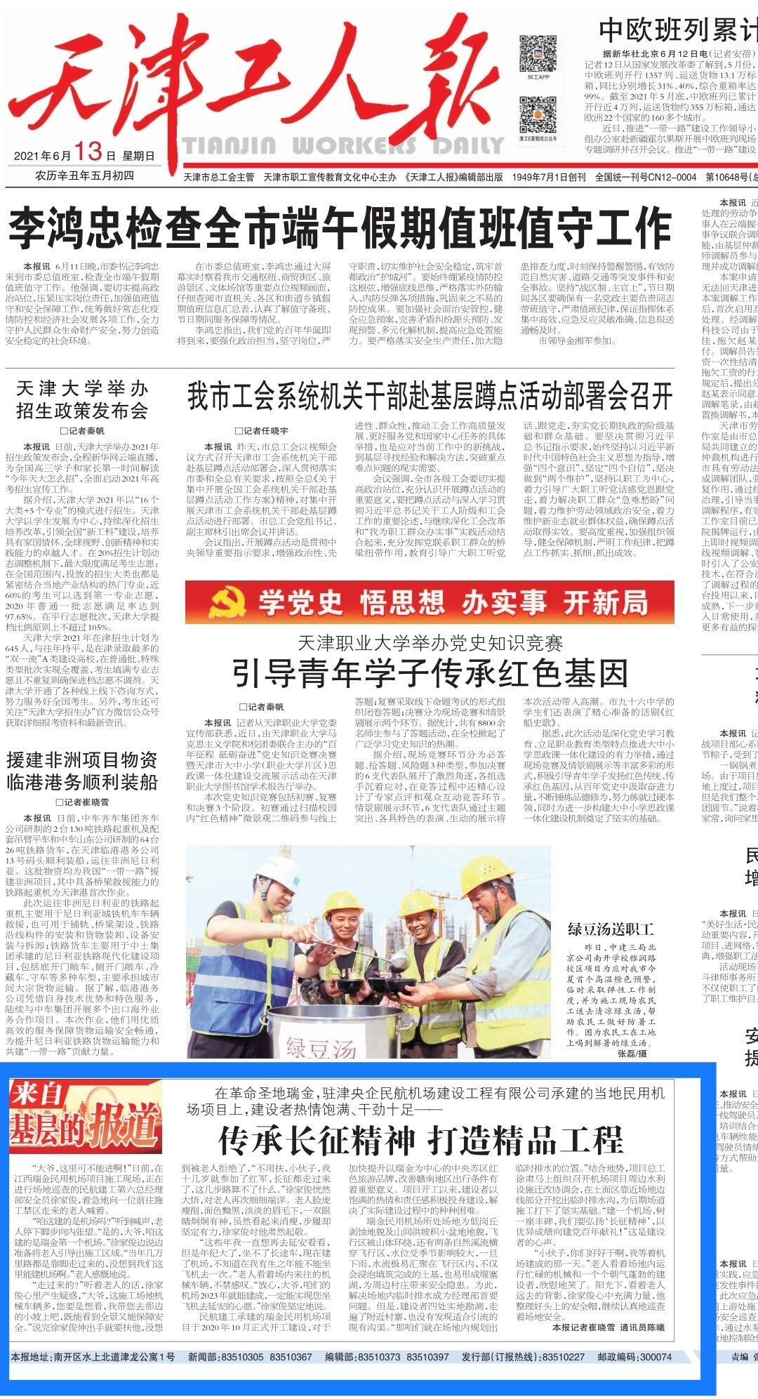 6月13日,《天津工人報》第10648號頭版“來自基層的報道”欄目,以《傳承長征精神 打造精品工程》為題,對公司第十六總經(jīng)理部項目團隊積極投身瑞金民用機場施工建設(shè),為紅色故都瑞金的基礎(chǔ)設(shè)施建設(shè)作出貢獻的事跡進行了專題報道。這是《天津工人報》今年以來,連續(xù)第4次頭版報道公司在建工程項目。